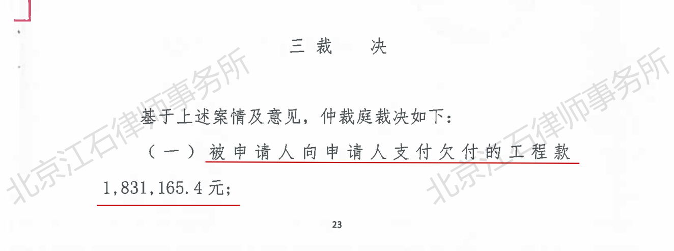 仲裁庭经审理认为,原告提交的《徐州地铁3号线最终结算书》具有法律效力,被告应支付欠付的工程款1,831,165.4元(扣除因增值税税率调整产生的价差26,743.04元)。被告应返还履约保证金50,000元,但原告主张的逾期利息不予支持。仲裁庭酌定原告承担本案15%的仲裁费,被告承担85%的仲裁费。最终裁决被告支付原告工程款1,831,165.4元、履约保证金50,000元及相应仲裁费,驳回原告的其他仲裁请求。
