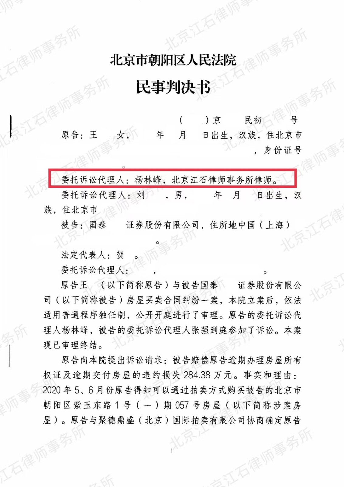 合同纠纷-江石律师代理王某诉国泰某证券有限公司获赔违约损失80万元